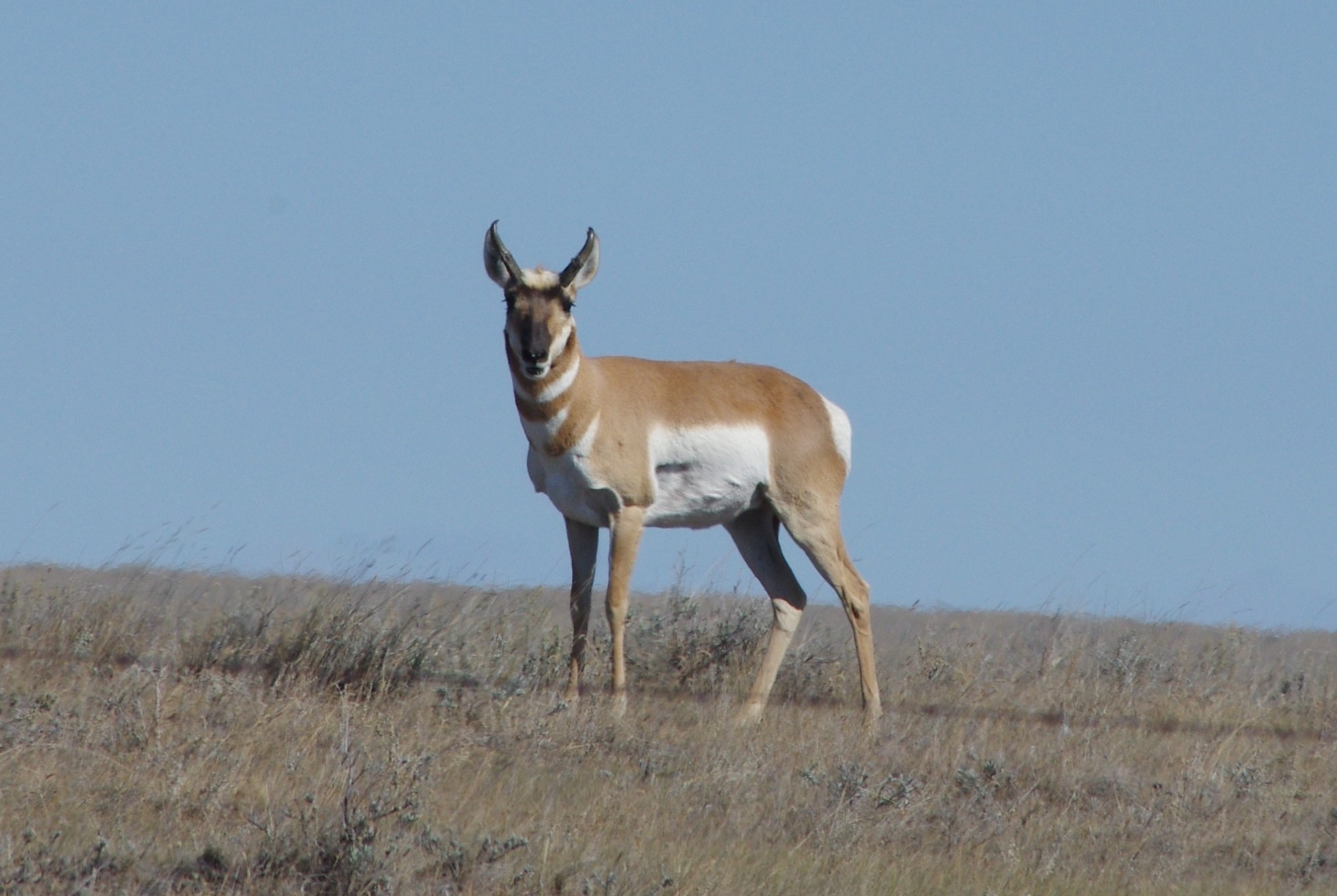 Antelopes are wary of vehicles like most wildlife but they will stand and stare near fences as you drive by. But note, if you stop your vehicle, the antelope are gone. We are not sure why, but it may relate to their learned knowledge about stopped vehicles having gun-carrying hunters in them.
