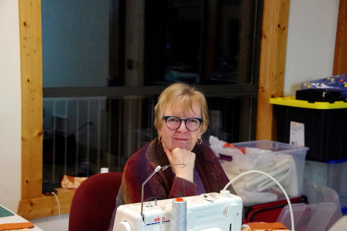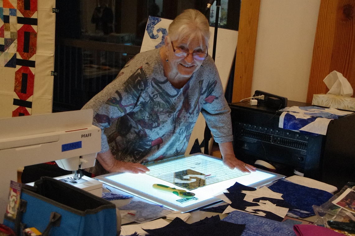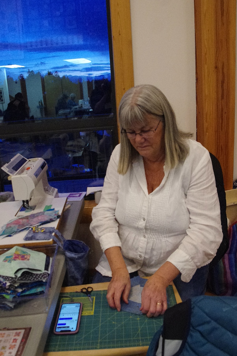 Sleeping accomodations were in the same building, and I shared a bedroom with another quilter. No TV out here, not that any of us missed it. We were busy quilting or reading or going walkabout to the lake. We set up design walls - a sheet of flannel where quilt blocks can be stuck to the flannel nicely, as the quilt layout plan is tested, and the quilt comes to life. The quilters help each other with layout, ensuring things like the same colored block is not right next to another same block. We were also very ready to share supplies if someone was short of anything. There was rarely a quiet moment, and the hum of sewing machines, laughter and chatter was a beautiful sound.